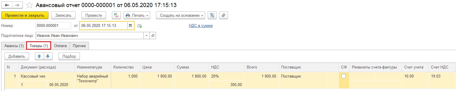 Если покупка отображается авансовым отчетом, то приобретаемый инвентарь показывается в разделе «Товары», как показано на картинке.