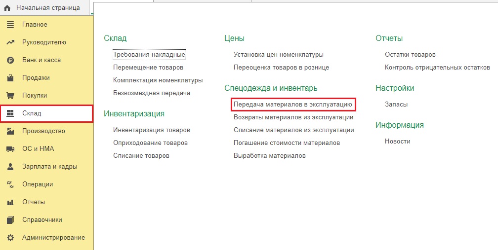 Для этого нужно зайти во вкладку «Склад» и выбрать «Передача материалов в эксплуатацию».