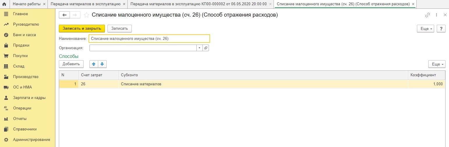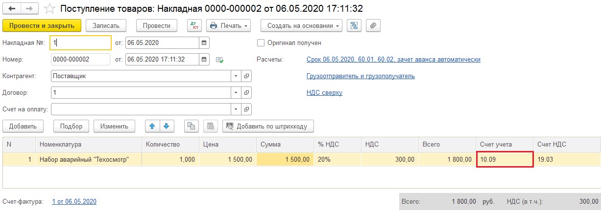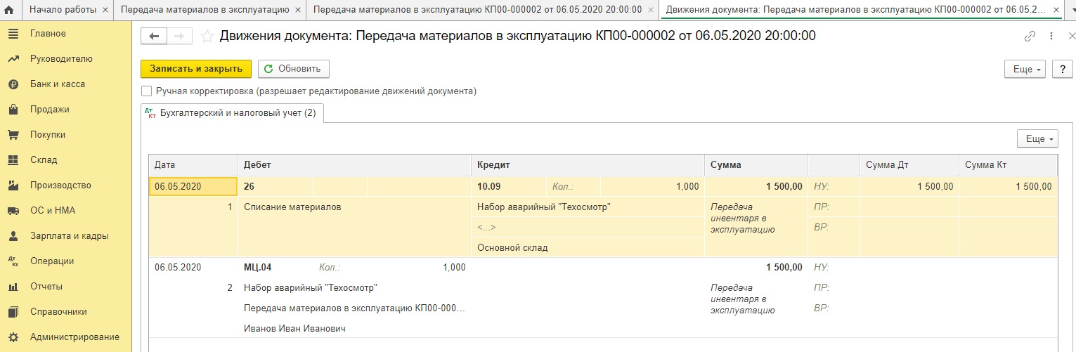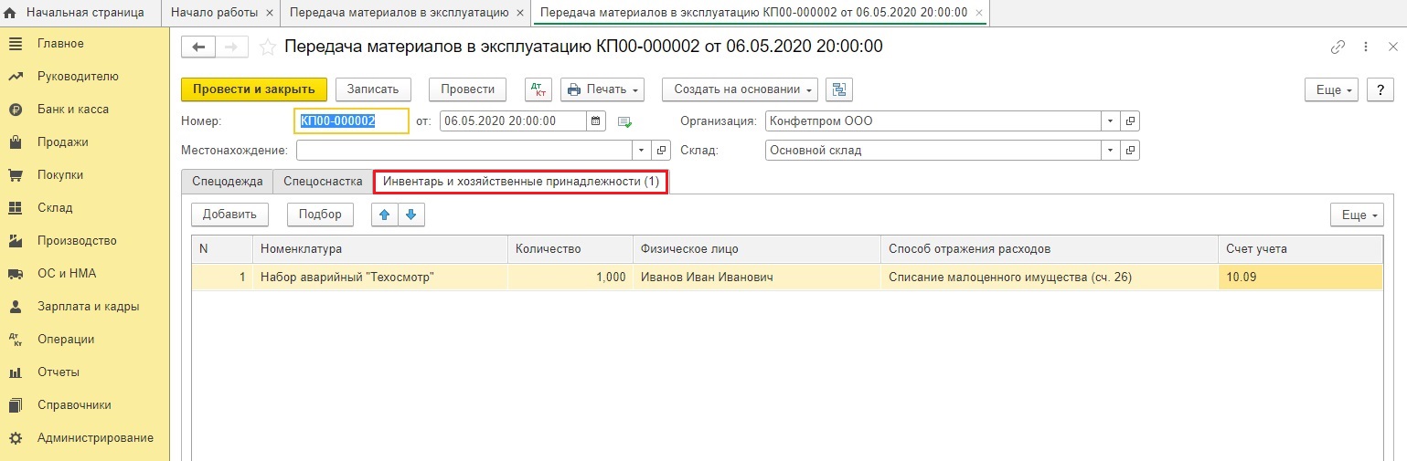 При проведении документ оформит проводки: Дт 26 Кт 10.09, а также отразит этот инвентарь на вспомогательном счёте МЦ.04, чтобы затем получилось сделать пересчет инвентаря в компании.