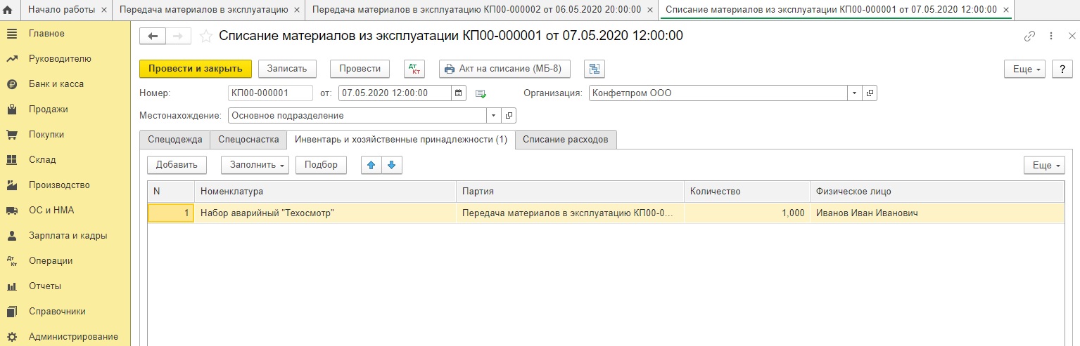 Когда нужно будет списать инвентарь с забалансового учета, понадобится ввести документ «Списание материалов из эксплуатации», основываясь на ранее внесенном «Передача материалов в эксплуатацию» или создав новый в категории «Склад».