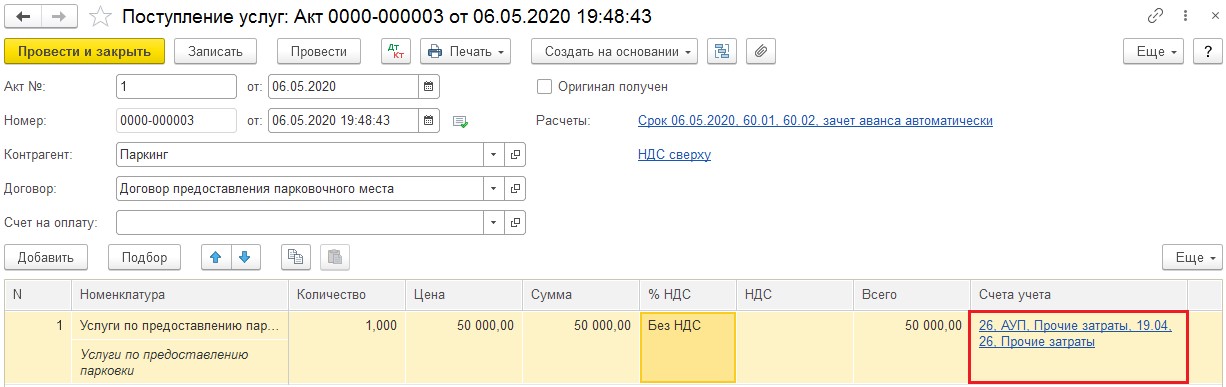 Акт об оказании услуги, который паркинг должен вам направить, вносится в программу в категории «Покупки» - «Поступление (акты, накладные)».