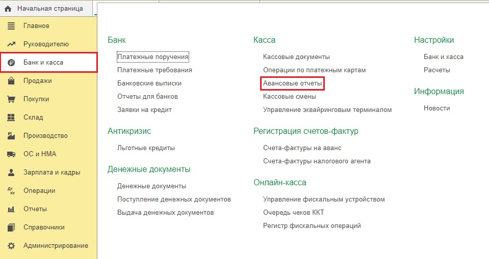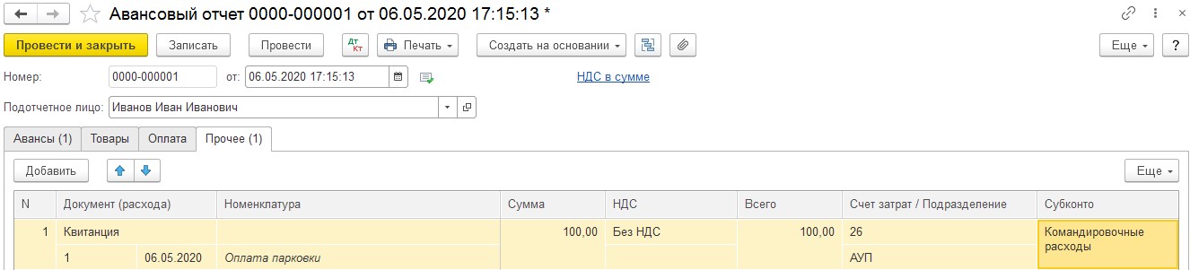 Если в бухгалтерию поступили квитанции, сообщающие об оплате парковки для служебной машины командировочным работником, в программу нужно внести «Авансовый отчёт» в категории «Банк и касса».