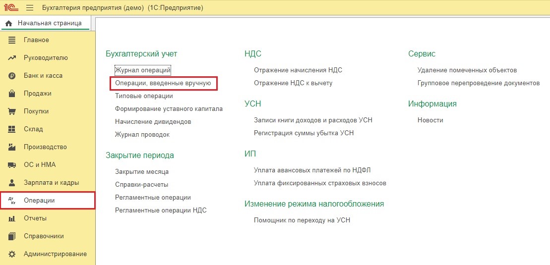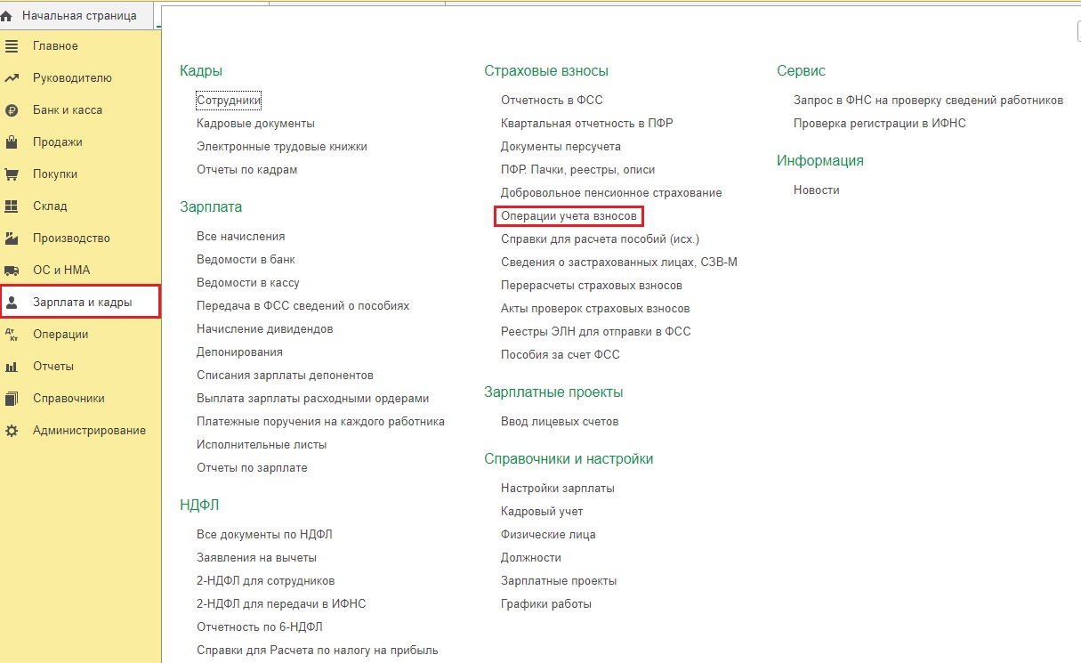 Для этого зайдем во вкладку «Зарплата и кадры» и выберем строку «Операции учёта взносов».