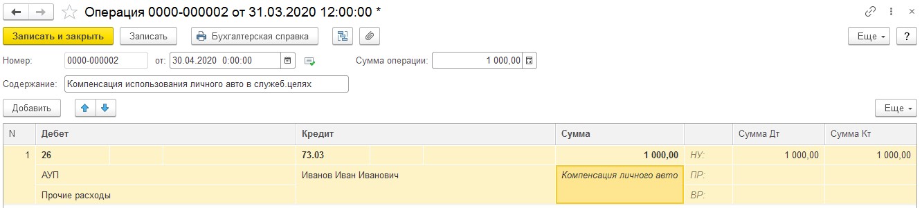 При применении личной машины в служебных целях, начисление компенсации вносится в категории «Операции» - «Операции, введённые вручную».