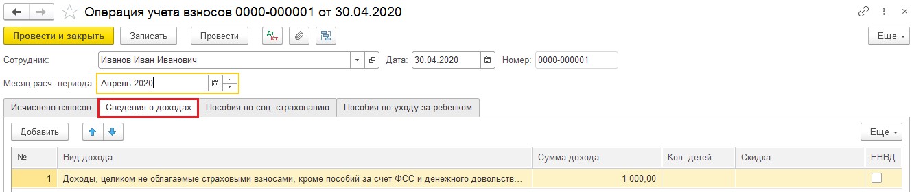 Сформируем новый документ. В нем в разделе «Сведения о доходах» добавим строчку и укажем сумму перечисленной компенсации.