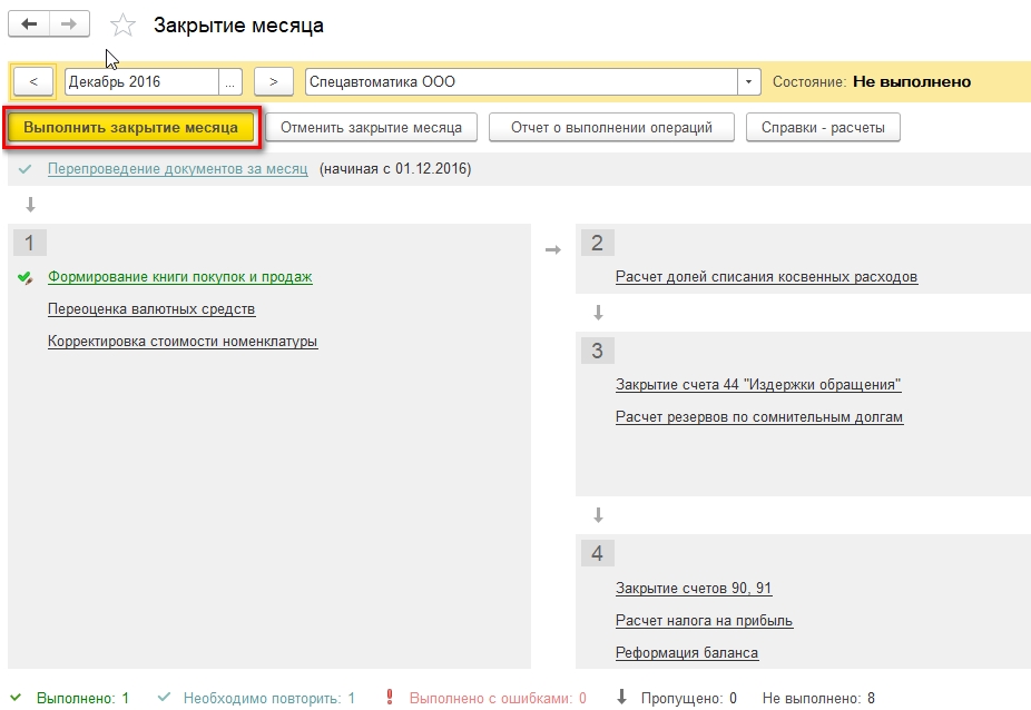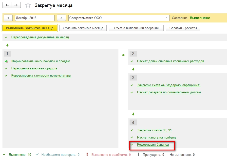 Реформация - последний этап, который следует выполнить при закрытии декабря. Ее не получится осуществит в случае, если осталась хоть одна незавершенная операция. Для закрытия месяца нужно нажать одноименную кнопку.