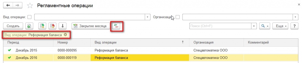 Логика операций соответствует принципу реформации, который был описан ранее. Просмотр проводок таким образом не слишком удобен. Вы можете получить к ним доступ через специальный раздел. Войдите в "Операции". Здесь вы найдете пункт "Регламентные операции", а в нем будет находиться раздел "Реформация баланс". Для удобства имеется сортировка операций по виду.
