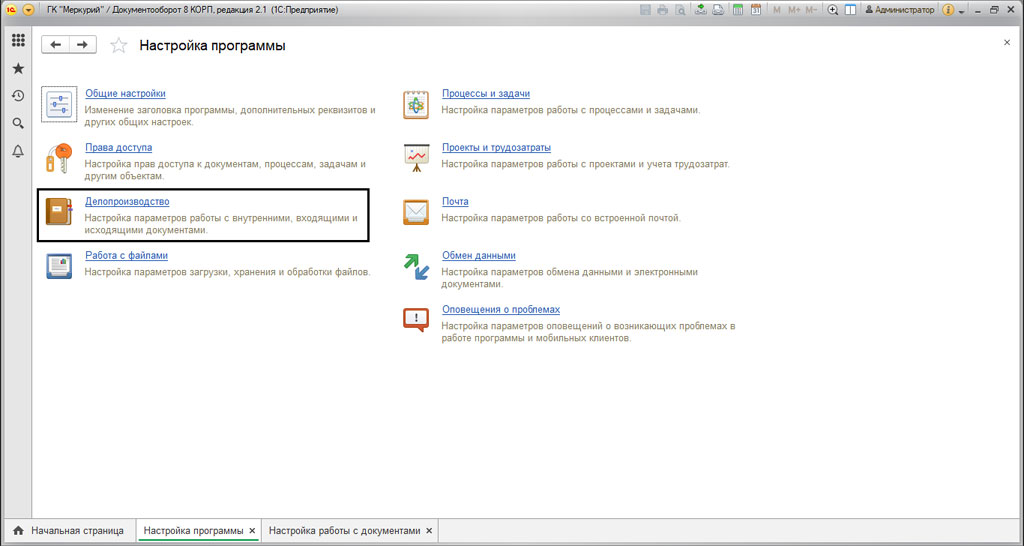 Для того, чтобы резолюция была доступна в программе, перед этим нужно установить специальную галочку в настройках программы. Для этого, перейдите в раздел "Настройки и администрирование", после чего нажимаем на "Настройки программы", выбираем "Делопроизводство".