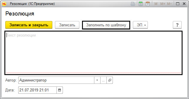 Пользователь может добавлять по несколько резолюций к любому документу. Для этого, ему нужно в открывшемся окне внести нужный текст. После чего нажать на кнопку "Заполнить по шаблону".