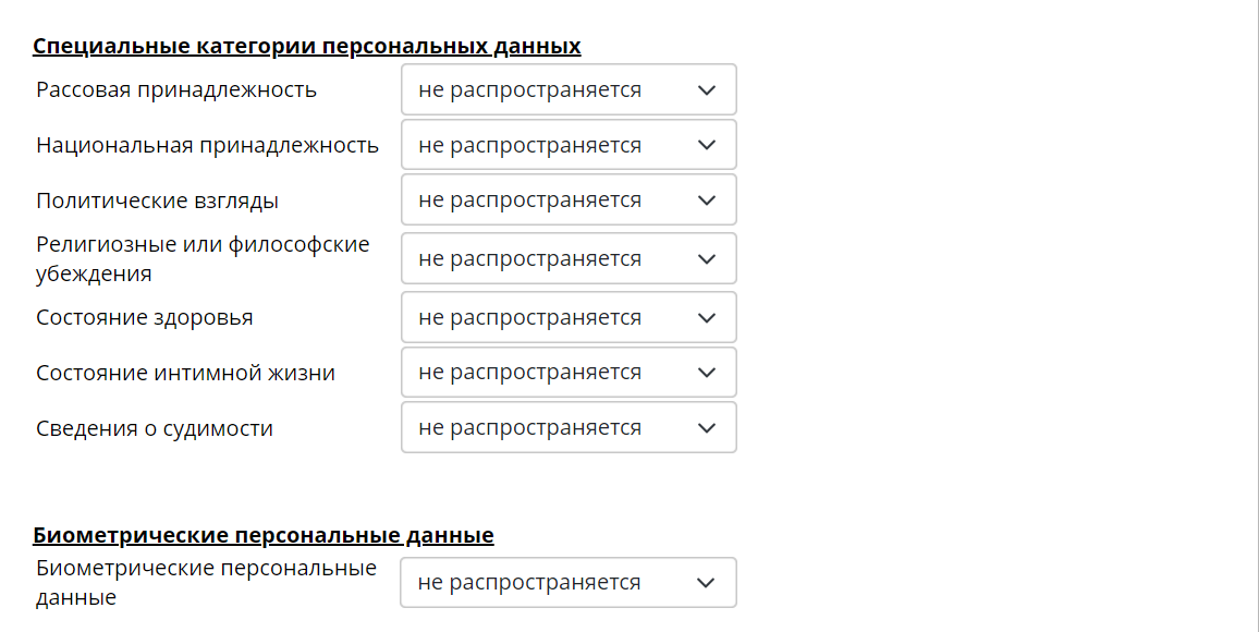 - категории и перечень данных, для обработки которых владелец указывает условия и запреты, а также список этих условий и запретов;