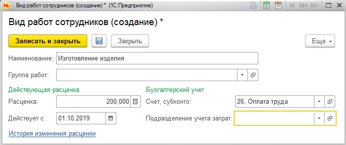 Изменённые настройки следует сохранить, нажав на «Применить и закрыть». После этого переходите к установке расценок: всё в том же разделе «Настройка» выберите «Виды работ». Нажмите на копку «Создать» и укажите все необходимые данные: наименование вида труда; дату, с которой начинается учёт; расценки. Часто нужно также указывать способ отражения в бухучёте и подразделение. Можно создать несколько видов работ с разными данными.