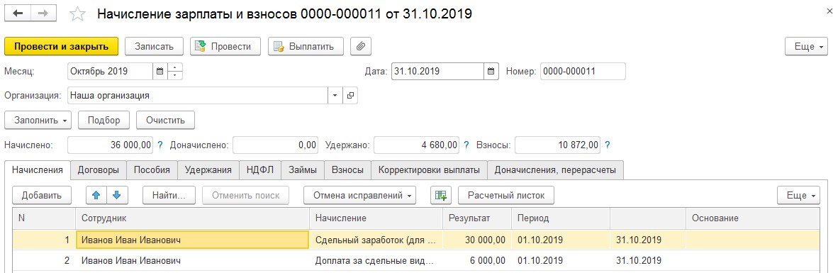 Проведите начисление при помощи документа «Начисление зарплаты и взносов».