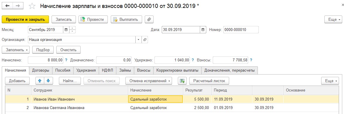 Подготовка данных на этом завершается, можно переходить к начислению зарплаты. Оно делается из раздела с тем же названием: выберите в нём «Начисление зарплаты и взносов», создайте новый документ, обозначьте расчётный период и нажимайте на «Заполнить».