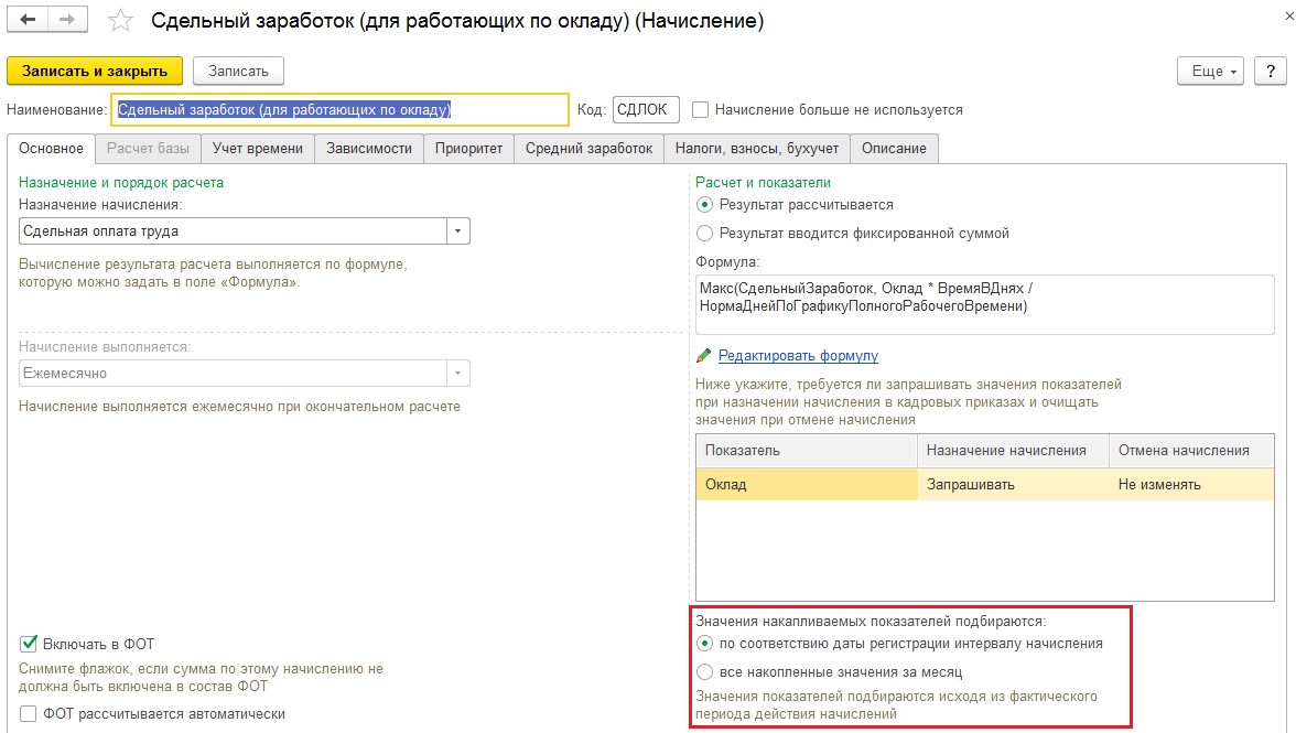Большая часть настроек останется такой же, как в рассмотренном примере, но потребуется создать ещё один вид начисления, чтобы можно было рассчитывать надбавку при перевыполнении плана. Выберите в разделе «Настройка» пункт «Начисления». В ранее созданных вариантах начисления «Сдельный заработок» (отдельно для работающих по окладу и по часовому тарифу) проверьте, как происходит накопление показателей за месяц.