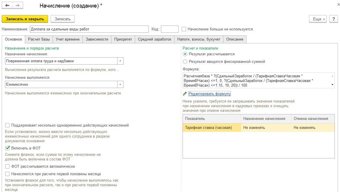 Чтобы создать начисление, введите наименование и назначение как на картинке ниже, установите ежемесячное начисление и галочку в поле «Включать в ФОТ». Если доплата за превышение плана будет фиксированной, в поле сверху справа выбирайте этот вариант. Если надбавка рассчитываемая – вариант «Результат рассчитывается».