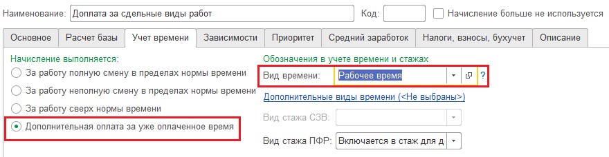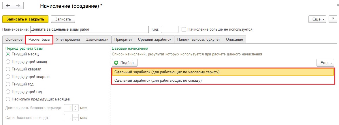 Поскольку в формуле есть такой показатель, как «Расчётная база», следует обозначить, что в неё включается. Для этого выберите вкладку «Расчёт базы» и укажите на ней те виды сдельных начислений, которые используются для расчёта.