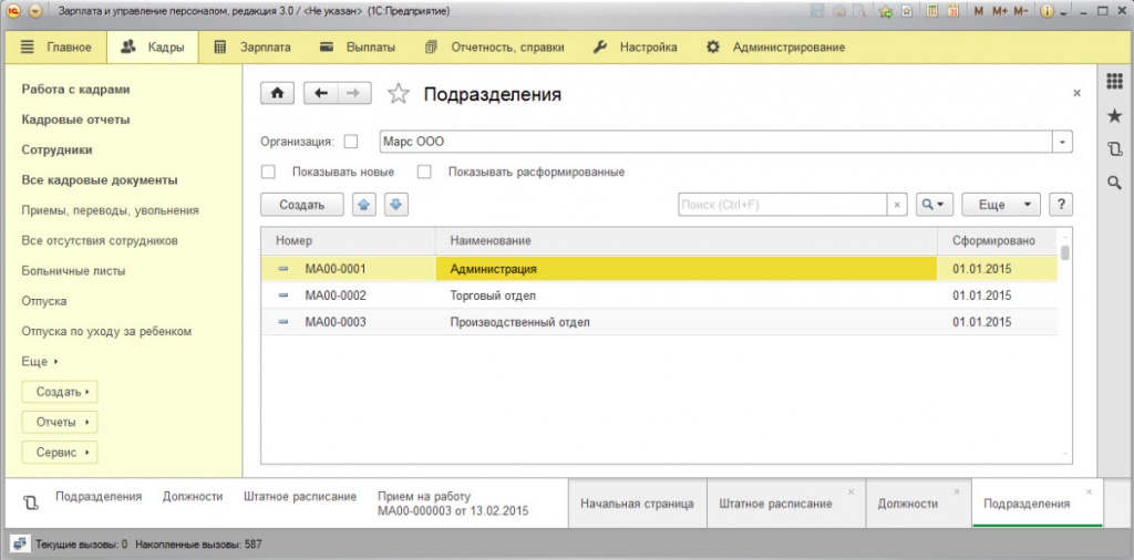 В целях создания расписания, нами произведено «связывание» «Подразделения» и «Должности» друг с другом. Возможно их внесение как заранее, так и одновременно с созданием элементов штатного расписания.