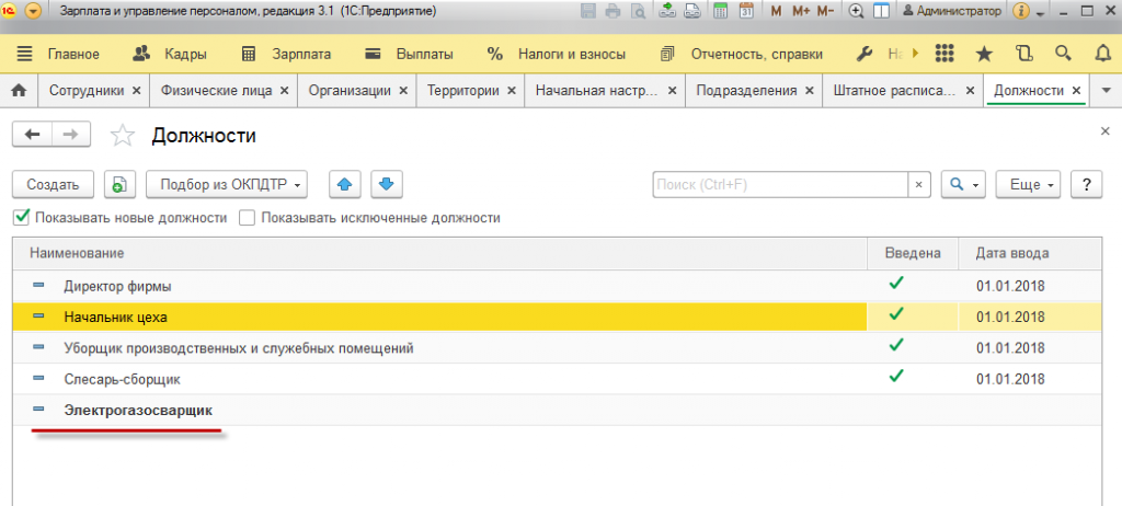 После закрытия ОКПДТР становится заметно, что новые введенные должности выделяются жирным шрифтом. Таким образом, программа 1С сообщает, что эта запись еще не является действующей, поскольку она новая и создана совсем недавно.