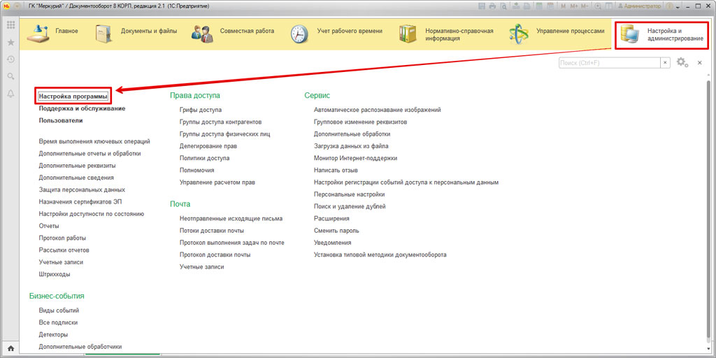 Для настроек уведомлений, администратору нужно перейти в "Настройка и администрирование", дальше заходим в "Настройки программы", дальше переходим в "Общие настройки программы".