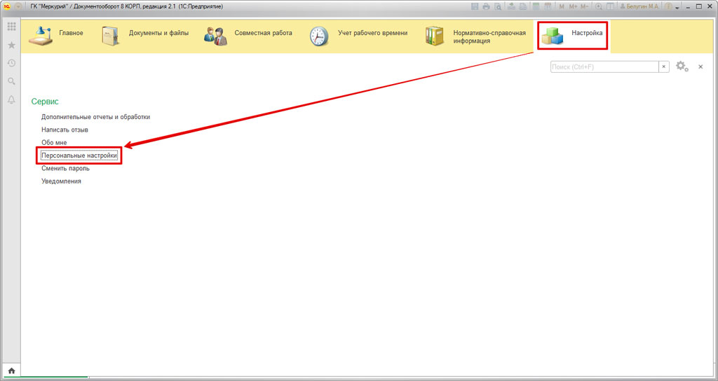Если администратор разрешил поменять все настройки уведомлений по умолчанию, то для внесения своих изменений вам потребуется перейти в раздел "Настройки", после чего переходим "Персональный настройки".