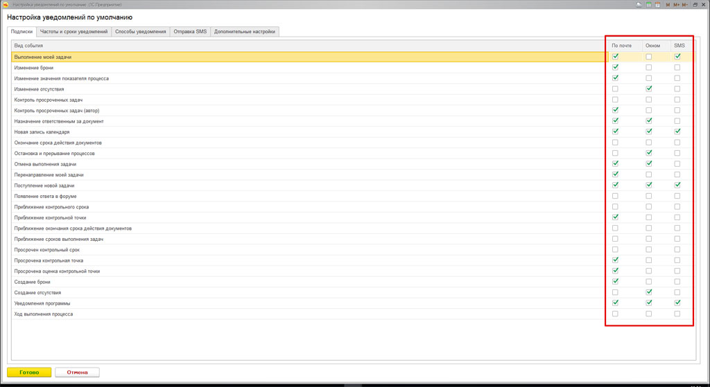 На первой вкладке, вы сможете настроить виды событий, по ним будут приходить уведомления. Всего существует 3 способа отправки уведомлений: отправка на почту письмом, всплывающим окном или СМС-сообщением.