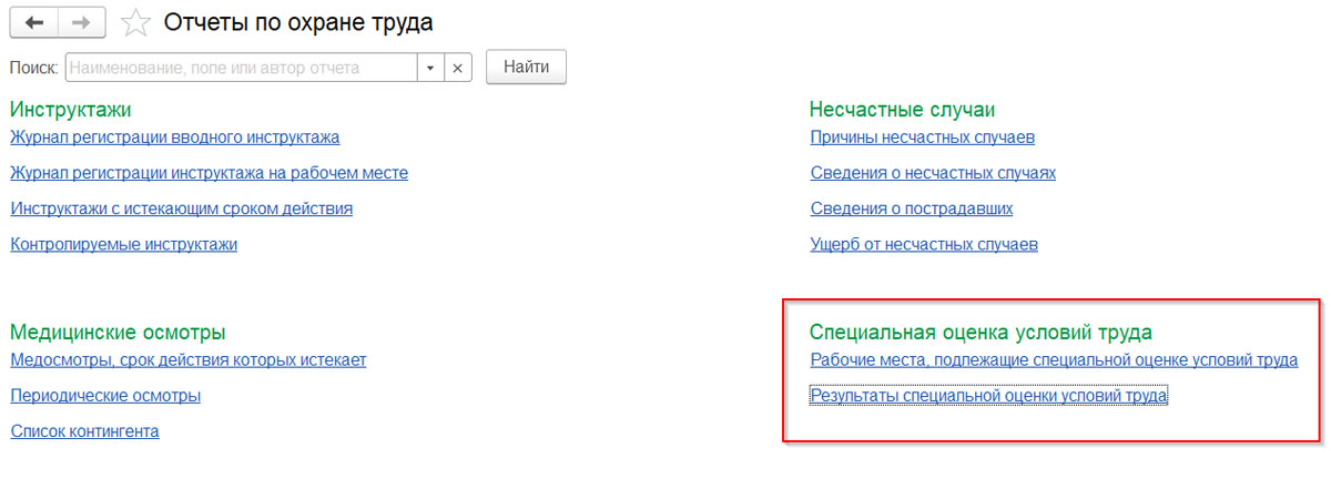 Все отчеты располагаются во вкладке "меню отчетов по охране труда".