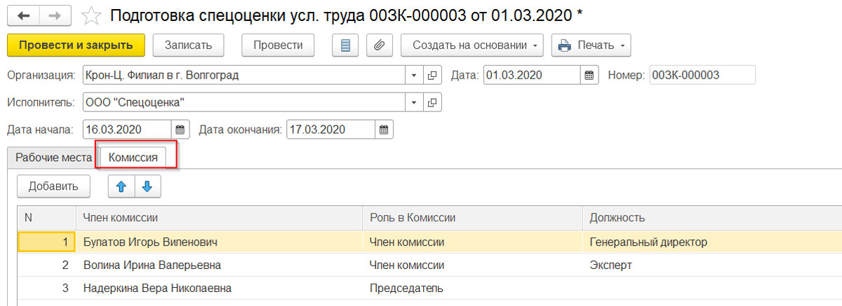 Вкладка "Комиссия" полностью идентична со вкладкой документы подготовки. Очень важно корректное указание "Даты результатов". Поскольку именно этой датой будет проходить приказ о СОУТ (его печатная форма).