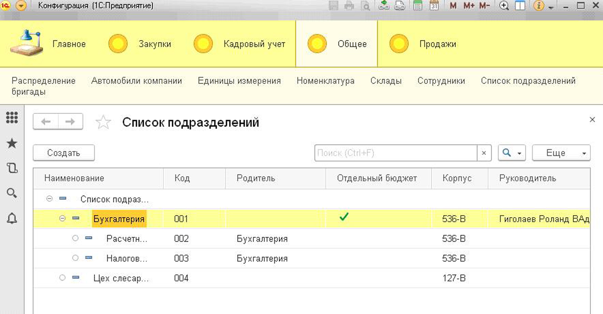 Демонстрационный справочник «Подразделения»  – создан, благодаря последовательности вышеуказанных действий. Теперь обновляем конфигурацию и перезапускаем систему, только в этот раз в режиме предприятия. Подсистема «Общее» обзавелась теперь функциональной клавишей «Список подразделений». При ее нажатии, откроется ранее заданная нами форма списка справочника, в которую можно вносить элементы.