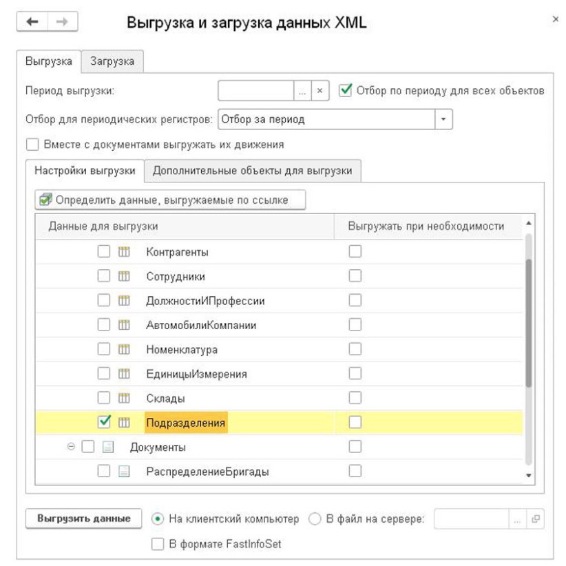 Открывая данный тип обработки, нужно указать какие именно объекты требуют переноса, и выбрать файл. Далее запущенный процесс выгрузки справочника автоматически создаст XML-файл, и запишет в него все данные.