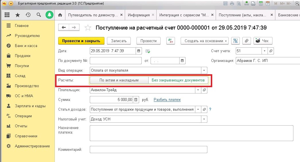 В качестве примера можно использовать поступление на расчетный счет компании. Оформляется новое «Поступление на расчетный счет». Из выпадающего меню «Вид операции» выбирается «Оплата от покупателя». Форма подраздела «Для расчетов» определяется как «Без закрывающих документов».