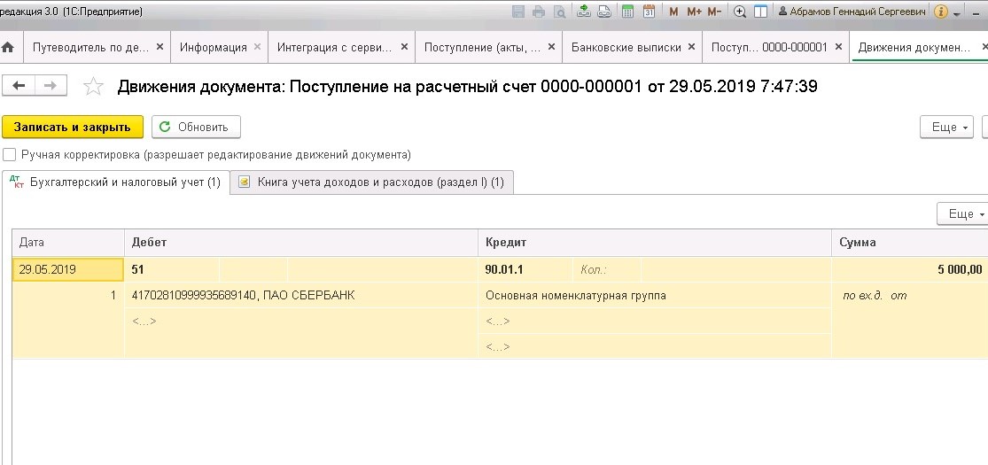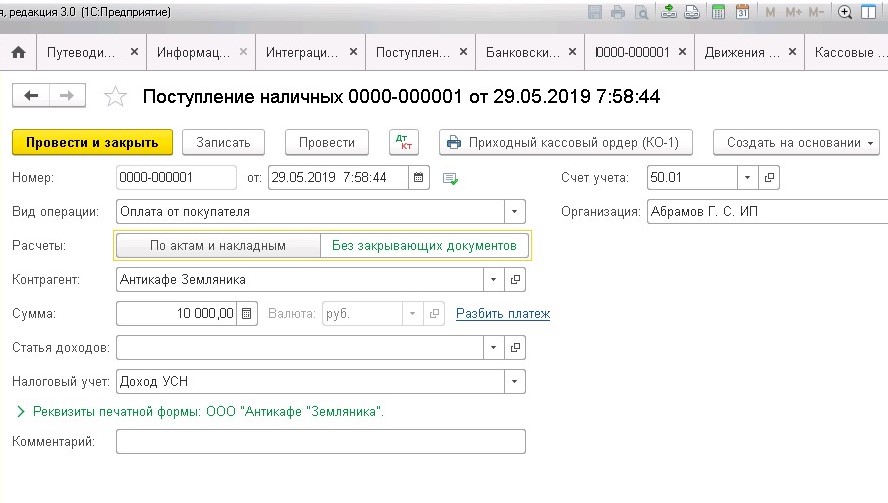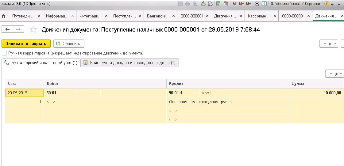 После проведения документа создаются проводки Дебет 50 Кредит 90.01.1.