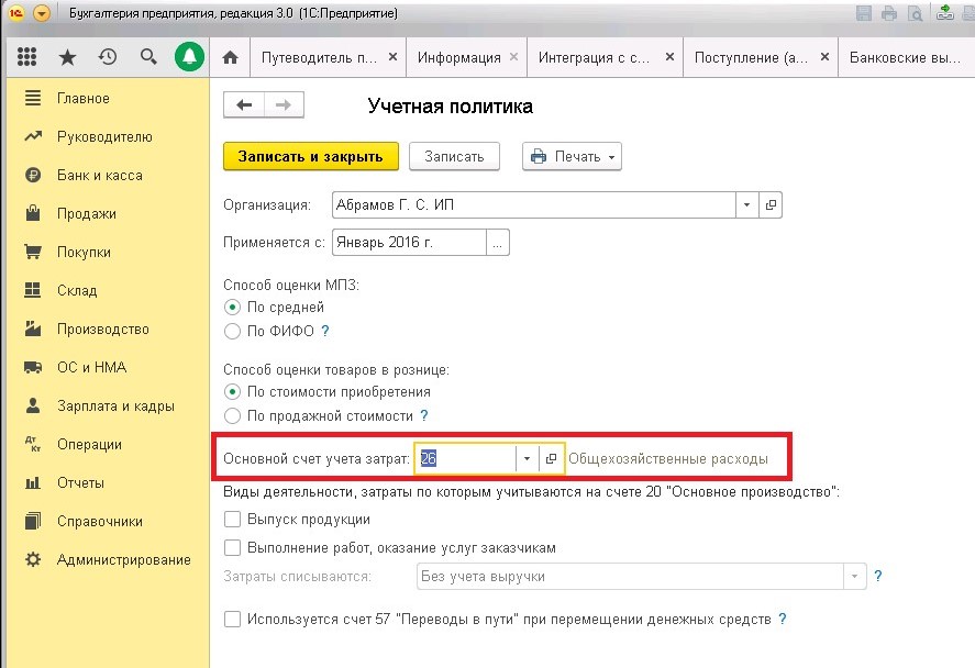 Дебетовые счета расходов меняются в разделе меню «Учетная политика». Например, вместо 20 счета можно использовать субсчет 44.01. Такие изменения актуальны для организаций, ведущих торговую деятельность.