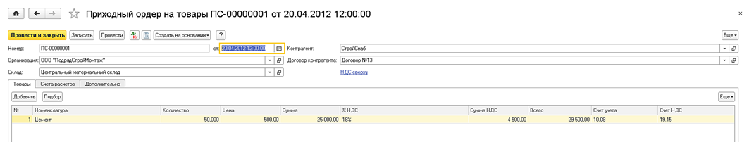 Документ «Приходный ордер на товары»