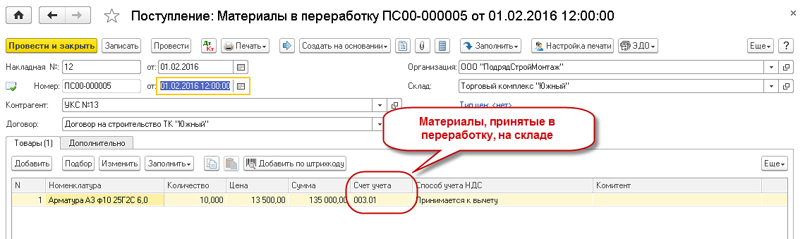 • Документом «Поступление в переработку» отражается поступление материалов на склад от заказчика