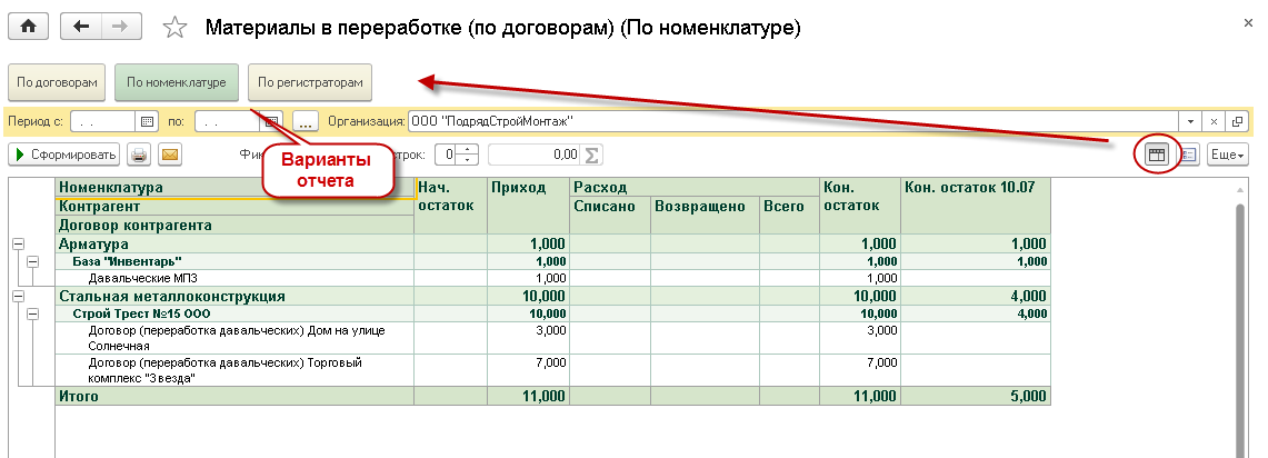• Отчет «Материалы в переработке» позволяет проанализировать движение собственных материалов, переданных в переработку, в разрезе договоров.