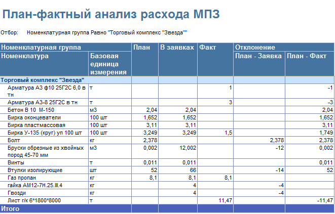 • Отчет «План-фактный анализ расхода МПЗ». Отчет предназначен для анализа расхода материалов и отклонения от сметных норм.