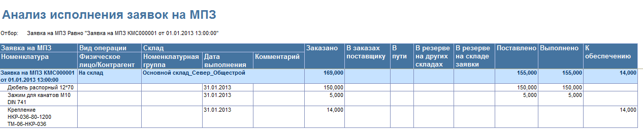 • Отчет «Анализ заявок на МПЗ». Контроль обеспечения материалами производится в отчете «Анализ заявок на МПЗ» и позволяет вывести информацию в необходимых разрезах: по дате выполнения, по объектам, по физическим лицам, по номенклатуре, по заявкам на МПЗ