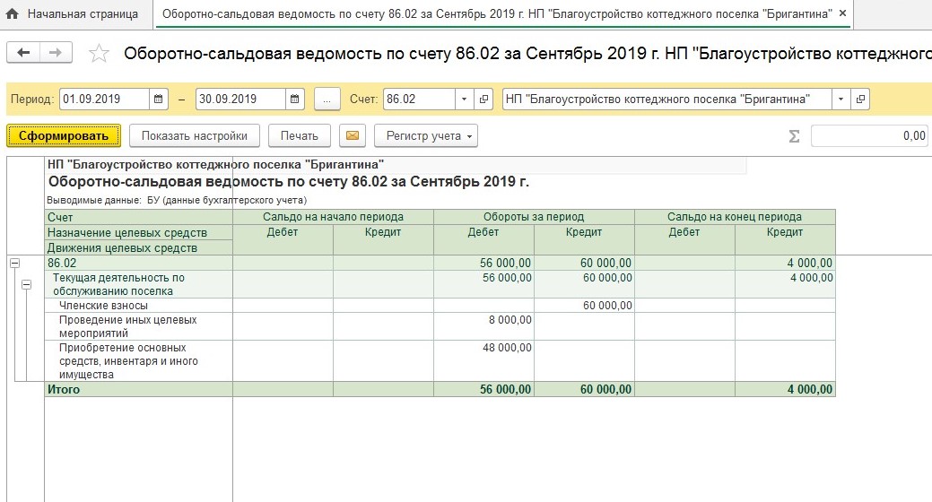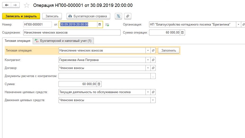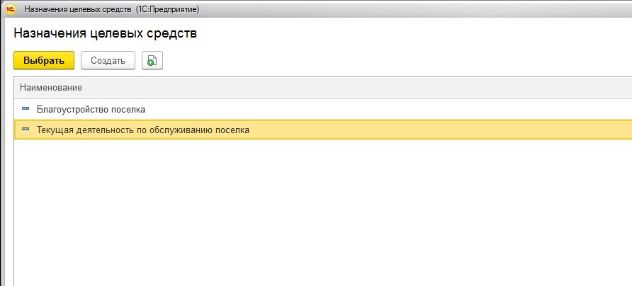 Отражение операций поступления и применения средств целевого назначения в программе можно рассмотреть на примере НКО, который занят эксплуатацией и управлением коттеджного поселка.