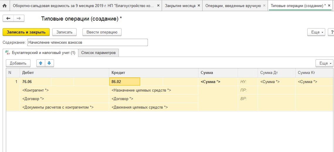 Как было сказано ранее, не предусмотрен программой документ для отображения начисления взносов. При необходимости можно это обозначить ручным способом. Создав в НКО типовую операцию, с помощью которой каждый месяц начислять членские взносы: