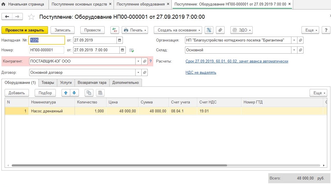 Основных средств приобретение отражается таким документом, как "Поступление оборудования":