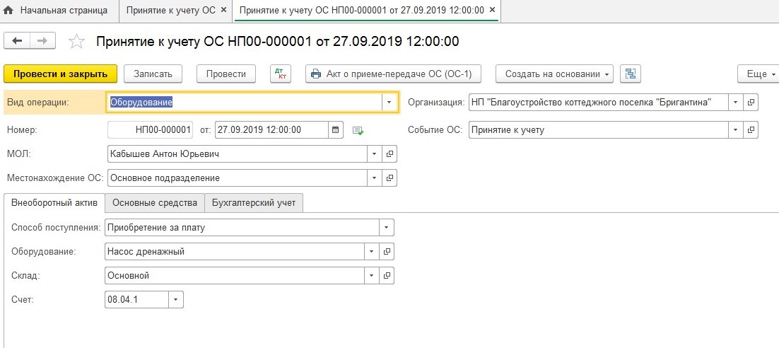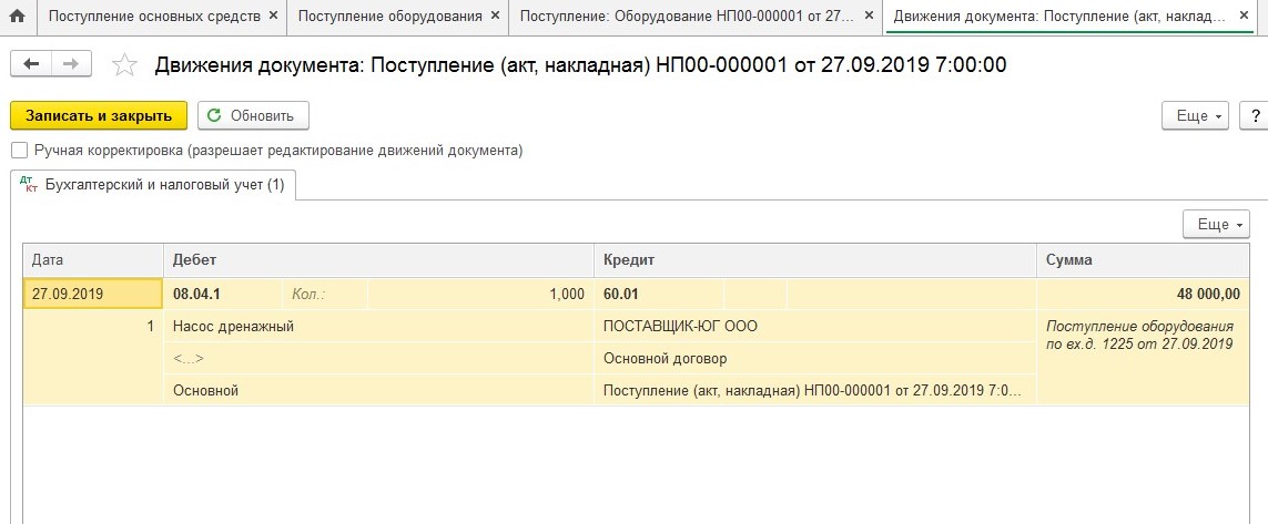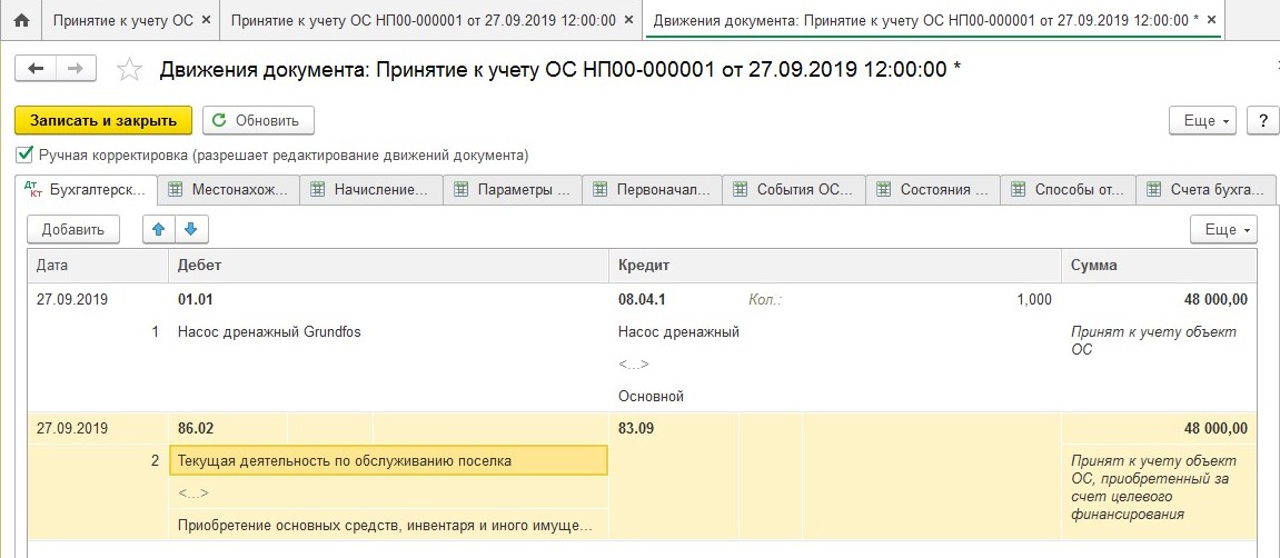 Этот документ для НКО не формирует проводку по приобретенному объекту основных средств. Поэтому требуется произвести проводку в ручном режиме, отредактировав движение документации установив соответствующие галочки "Ручная корректировка", также добавления к существующей проводке