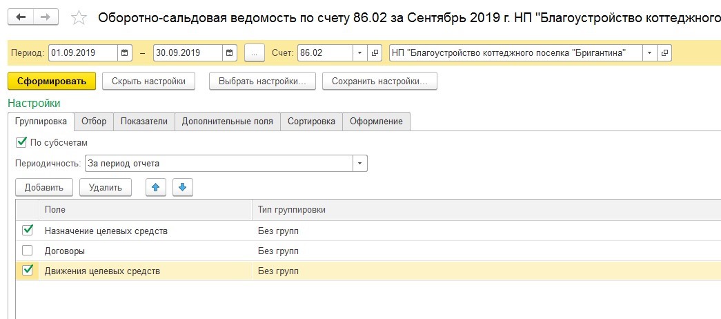 Можно для большей наглядности сформировать по счету 86 оборотно-сальдовую ведомость, установив в настройках галочки: