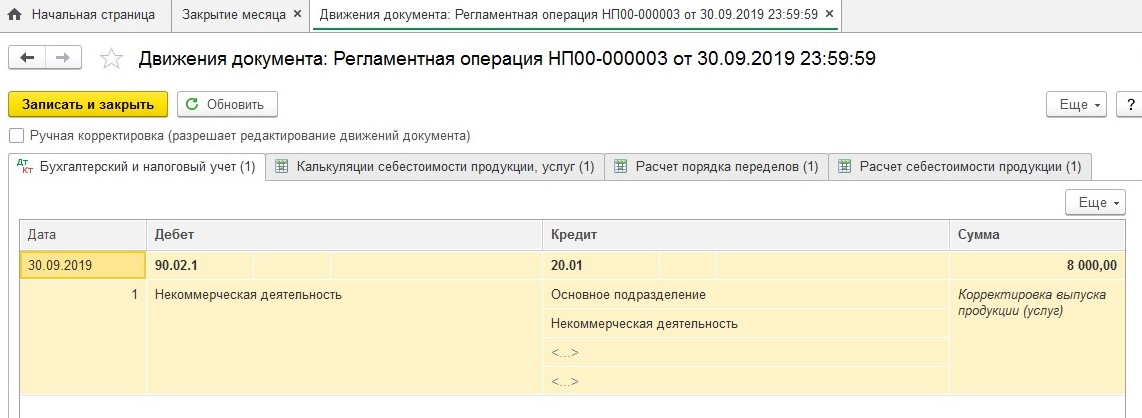 Затраты, которые в конце месяца в случае операции "Закрытия месяца" собраны на двадцатых счетах должны быть списаны на 90 счет.