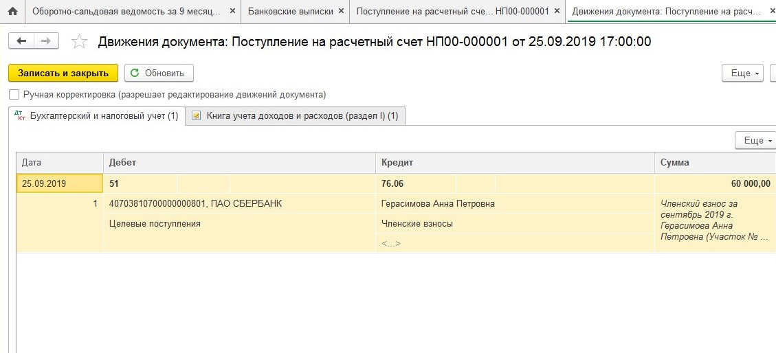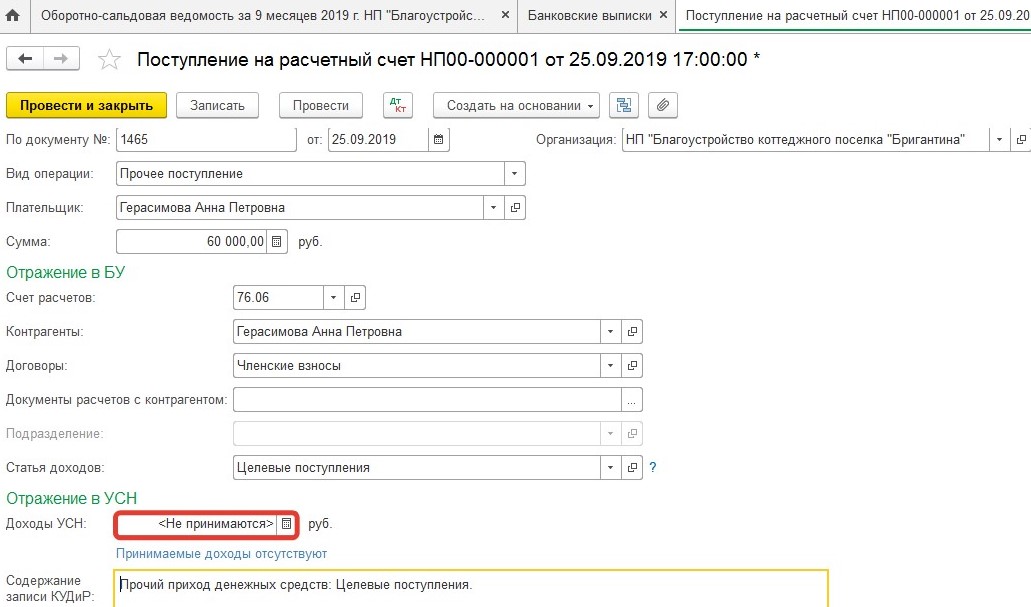 Отображается поступление взносов членов НКО таким документом, как "Поступление на расчетный счет", с обозначением "Прочее поступление":