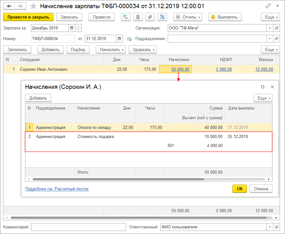 Нажав гиперссылку в графе "Начислено", пользователь может ознакомиться с информацией по всем начислениям. При необходимости их можно изменить. Далее в форме "Начисления" в графе "Дата выплаты" нужно указать дату, когда подарок вручен. После этого НДФЛ будет удержан с ближайшей выплаты зарплаты.