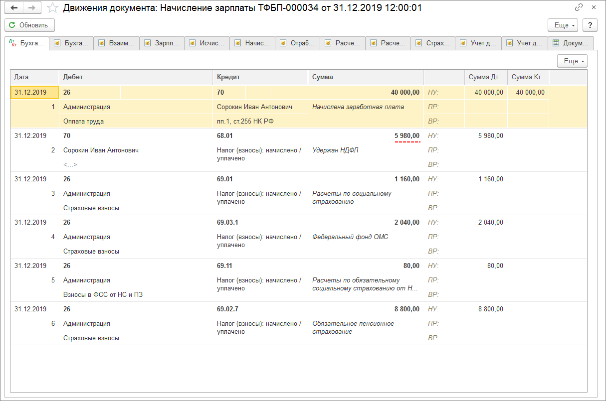 После того как вся информация внесена и проверена, пользователь нажимает кнопку "Провести". Результат проведения документа можно посмотреть через кнопку "Показать проводки и другие движения документа".