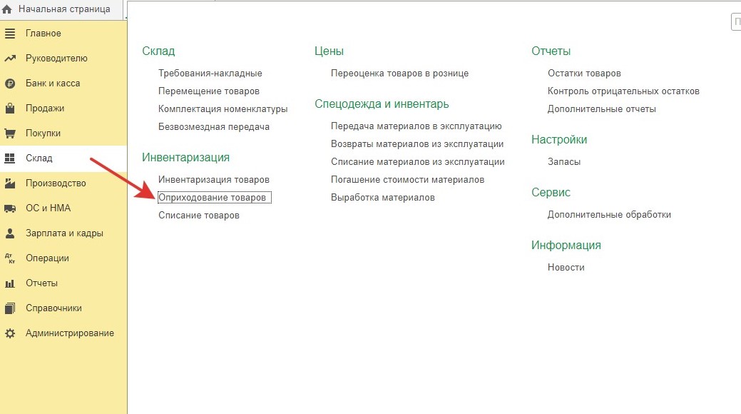 Нужно заметить, что в учете оприходование всех материальных ценностей, которые остались после демонтажа забора, отражается следующим документом под названием "Оприходование товаров". Его можно отыскать в разделе "Склад".
