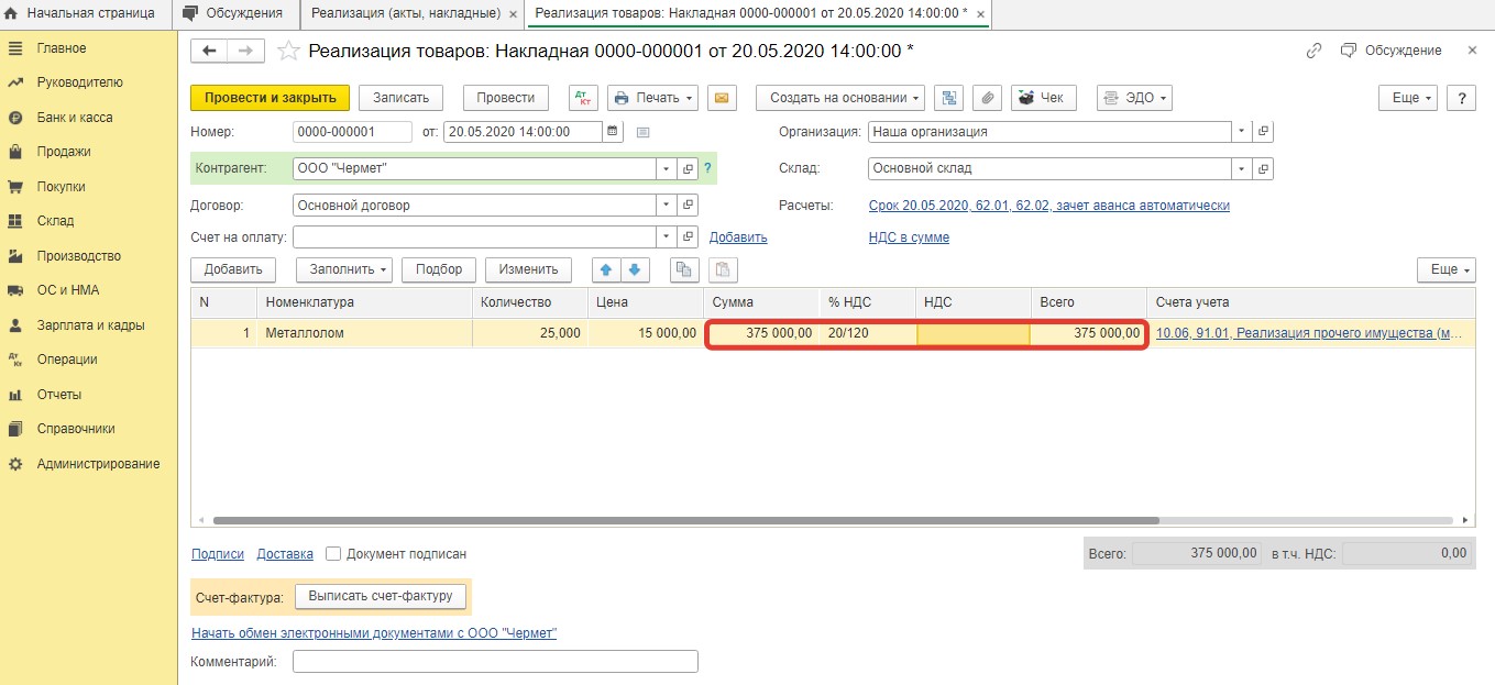 Ранее было отмечено, что компания заключила договор купли-продажи лома. В рамках данного договора наша компания предварительно получила оплату в размере 100 000 рублей без НДС. После этого была произведена отгрузка лома на сумму, составляющую 375 000 рублей без налога.