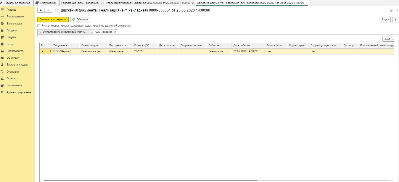 После этого пользователь должен оказаться в режиме ручной корректировки движений определенного документа. Потом, войдя в регистр "НДС Продажи", надо заменить значение "Реализация" на показатель "Налог исчисляет покупатель".