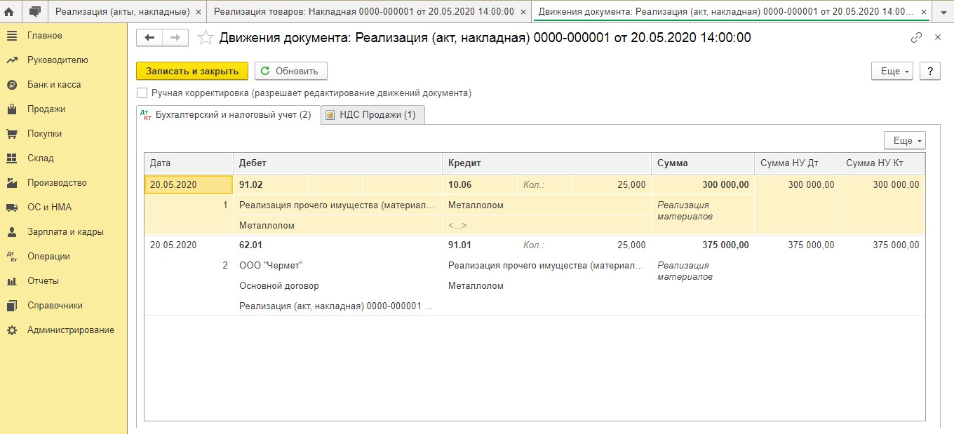 При этом акт комиссии об оприходовании металлолома выступает главным основанием для составления этого документа. Сразу после проведения документа данная программа создает следующую проводку: